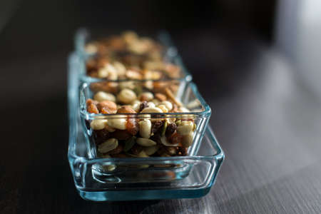 Mix of Healthy Snack of nuts and Other Dried fruits mix on tall crystal glass with gray background. Organic and healthy breakfast. Top view, Copy space, Selective focus.