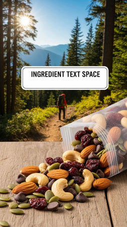 Hand holding a healthy snack on the top of the mountain after climbing. Consisting of different nuts and dried fruit, with beautiful background of mountain and forest in the summer.