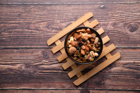 healthy plant-based food recipes concept, vegan nuts and legumes snack mix in wooden bowl