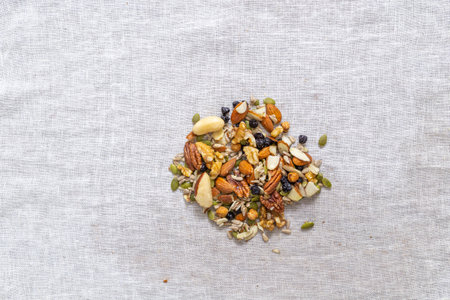 Mix of Healthy Snack of nuts and Other Dried fruits mix on gray background. Organic and healthy breakfast. Top view, Selective focus.
