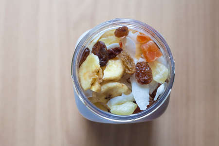Plastic jar with mixed dried fruit on wooden surface. Selective focus. high-angle view