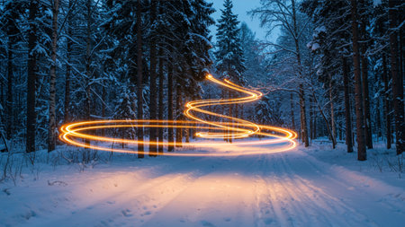 The winding curves of a forest road enhanced by the mesmerizing glow of car light trails