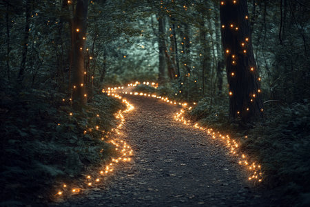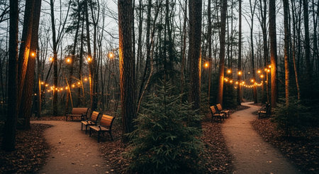 A serene forest pathway lit by warm string lights creates a cozy atmosphere at dusk, inviting exploration and connection with nature's beauty.