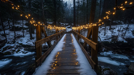 Christmas lights softly illuminating a rustic wooden bridge over a frozen creek, creating a cozy, nostalgic holiday ambiance in the wilderness
