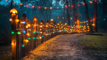 A path is lit up with colorful Christmas lights. The lights are arranged in a row, with some of them being taller than others. The path is surrounded by trees, creating a festive atmosphere