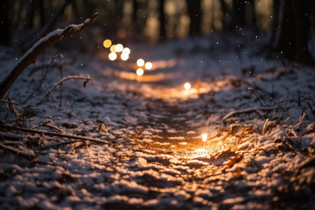 A path in a forest is lit up with glowing lights. The lights are scattered along the path, creating a warm and inviting atmosphere. Concept of wonder and magic