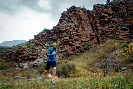 Athlete runs high in the mountains among the rocks. Bearded guy jogging in the mountains. Trail running