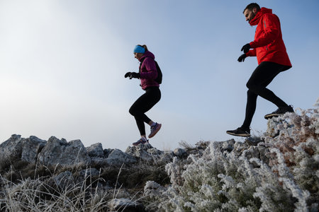 Athlete couple trail running on the mountain top in the early morning. Sky running concept