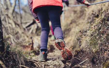 Lady hiker walking through the rocky land. Focus on the foot