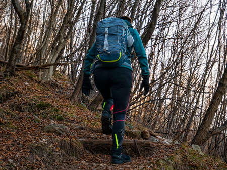 Trekking scene in a woodland of the italian alps