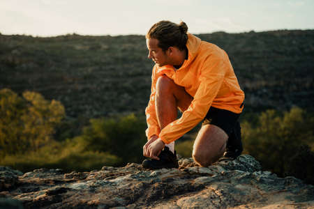 Caucasian male athlete stopping to take a break tying shoe lace while on outdoor run in wilderness