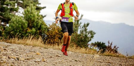 Male athlete run mountain race wth hydratation trail vest for running