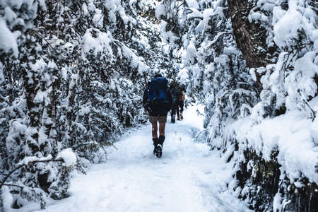 A small group of tourists traveling through the snowy woods in winter cloudy day. Tourists walking through the winter forest. Go through the trees