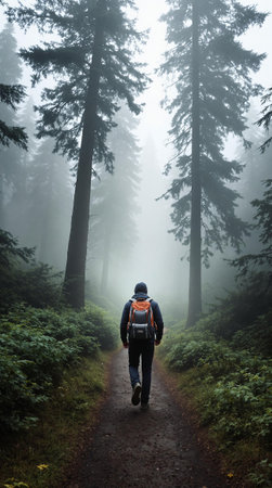 A solitary figure with a backpack trekking along a path enveloped in mist among tall trees, symbolizing adventure and exploration.