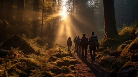 Hikers walk in forest at sunset or sunrise, group of people in pine woods. Scenic view of men, sunlight and trees in summer. Concept of hiking, journey, nature, adventure and travel. Generative AI.