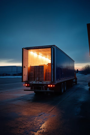 A serene nighttime view of a parked truck at a loading dock, showcasing its prominent presence and the interplay of light and shadow in an industrial setting.