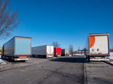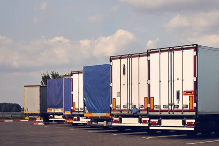 Modern trucks of various models are in a row on truck stop. Back view.