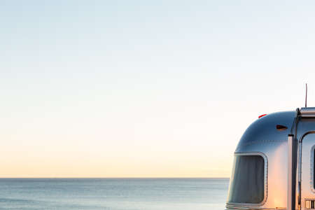 A trailer parked on the beach next to the ocean. Digital image.