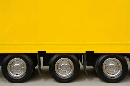 Detail of the empty yellow side of a large truck with three wheels
