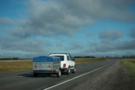 Car with a trailer moves on a road