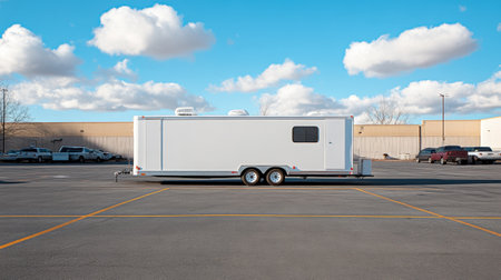 A large white semi truck trailer is prominently featured, parked on an expansive open lot under a clear sky, ready for transport.