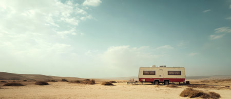 A vintage caravan rests in an expansive desert landscape under a clear sky surrounded by sparse vegetation and distant hills.