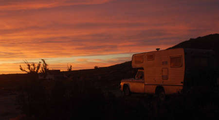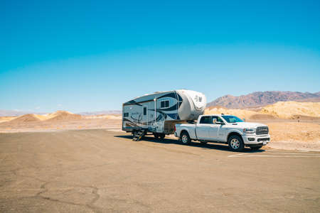 Death Valley National Park, CA, USA - April 15, 2021 Death Valley road trip, camper trailer in desert. Harmony Borax works viewpoint