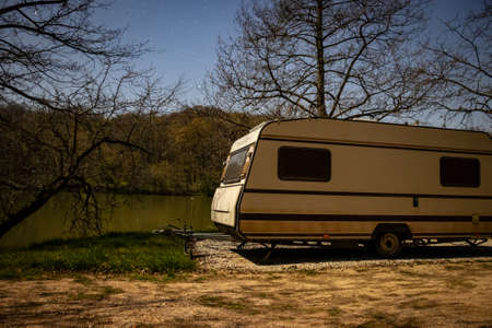 Caravan at night by a lake