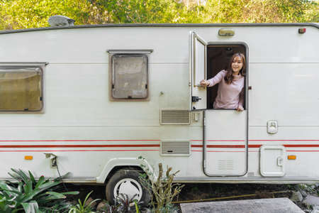 happy young woman at window of a camper RV van motorhome