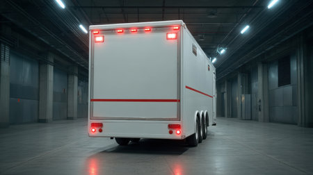 This image features a rear view of a modern white delivery truck parked in an industrial warehouse, showcasing red lights in a spacious and dim environment.