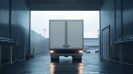 A truck moves through a warehouse entrance on a rainy day. The scene captures the essence of logistics and transport in an industrial environment.