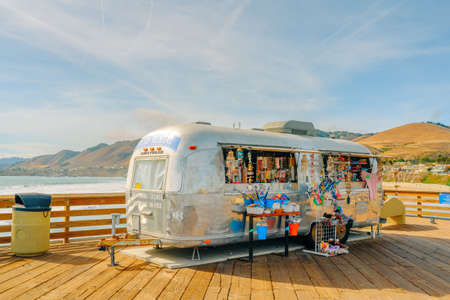 Pismo Beach, California, USA - June 3, 2022. Pismo Beach pier marketplace, ocean view, and cloudy sky on background