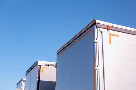 Isotherm cargo semi-trailers on a background of blue sky. The concept of the capacity and volume of a modern semi-trailer in cargo transportation, industry. Copy space for text, shipping