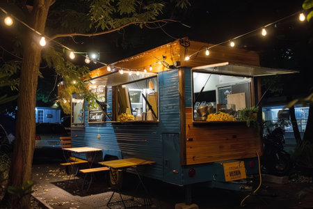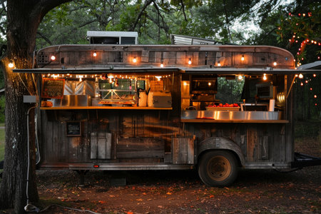 Cozy Food Truck With Hanging Lights, A cozy food truck with a cozy atmosphere, serving up comforting dishes like mac and cheese and grilled cheese sandwiches