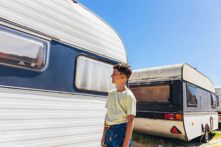 A boy stands in front of a camper on a seaside holiday
