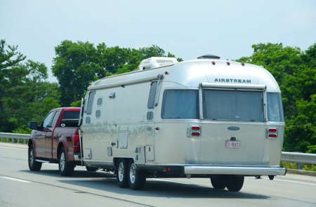 Kentucky U.S.A - August 20, 2021 - A white Airstream RV pulled by a red pickup truck