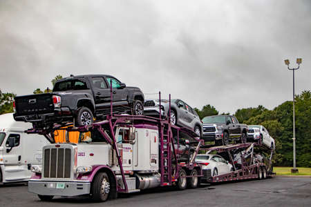 Augusta, Ga USA - 08 23 21: semi truck hauling cars on a cloudy day
