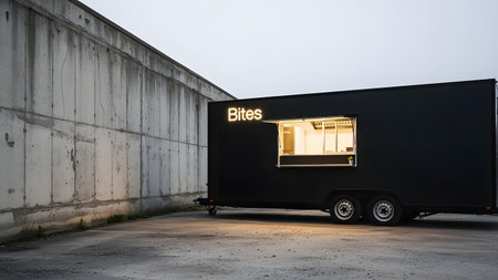 A sleek, matte black food trailer with a glowing 'Bites' neon sign parked against a concrete wall. The minimalist mobile kitchen features an open service window and warm interior lighting, creating a modern urban vibe.