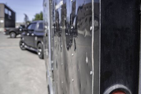 Freight vans stand in a row, rear view, trucking industry and sun, trucking trailer