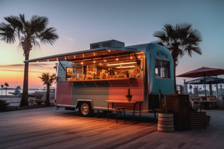 Food truck on a tropical wooden deck surrounded by palm trees. Generative AI