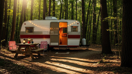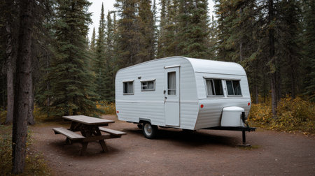 A vintage trailer parked in a serene forest atmosphere, accompanied by a rustic picnic table, inviting outdoor adventures and peaceful getaways in nature.