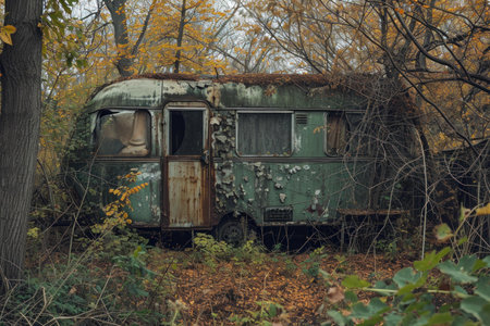 Old, rusty bus covered with moss and vines amidst the fall foliage