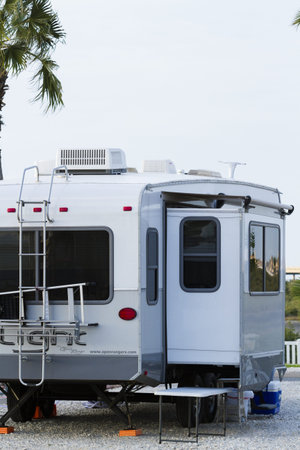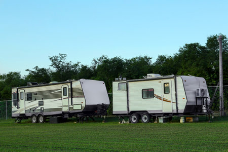 Travel trailers parked outdoors. Home on wheels