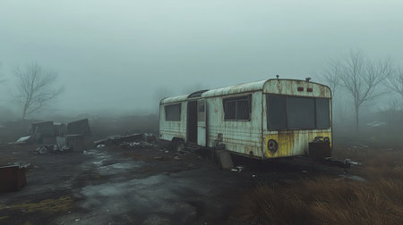 An abandoned trailer sits in a foggy landscape, surrounded by overgrown grass and scattered debris, evoking a sense of isolation and mystery.