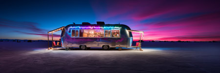 Cozy caravan parked in a snowy field, illuminated by warm light, creating a peaceful winter camping scene at dusk
