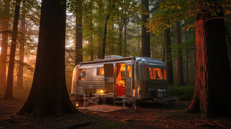 An inviting camping scene showcases a vintage trailer illuminated by warm interior lights. A campfire blazes brightly, casting a golden glow on the surrounding forest. The composition features a serene atmosphere, suggesting an evening or night setting amidst tall trees. This image is suitable for various commercial uses, including travel and lifestyle themes.