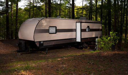 Travel trailer lighted in the forest next to North Carolina's Jordan Lake late in the afternoon.