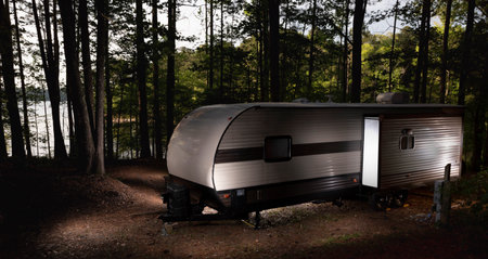 Caravan trailer in the forest at sunset. Traveling with motor home concept.