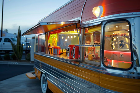 A retrochic food truck is parked on the side of the road, A retro-chic food truck with a retro aesthetic, serving up classic diner favorites with a modern twist