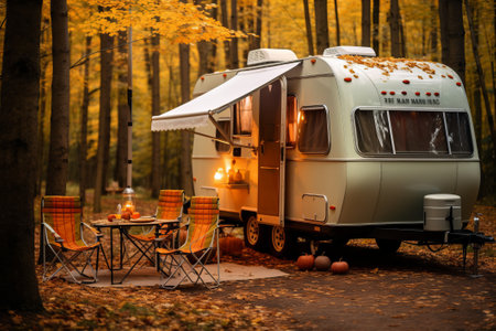 Mobile home van with terrace at sunset in autumn, mobile home, orange fallen leaves. autumn decor, pumpkins.